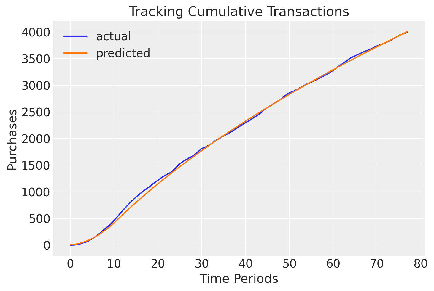 This dataset is an example of continuous time, non-contractual transactions because it comprises purchases from an online music store. PyMC-Marketing provides several models for this use case: