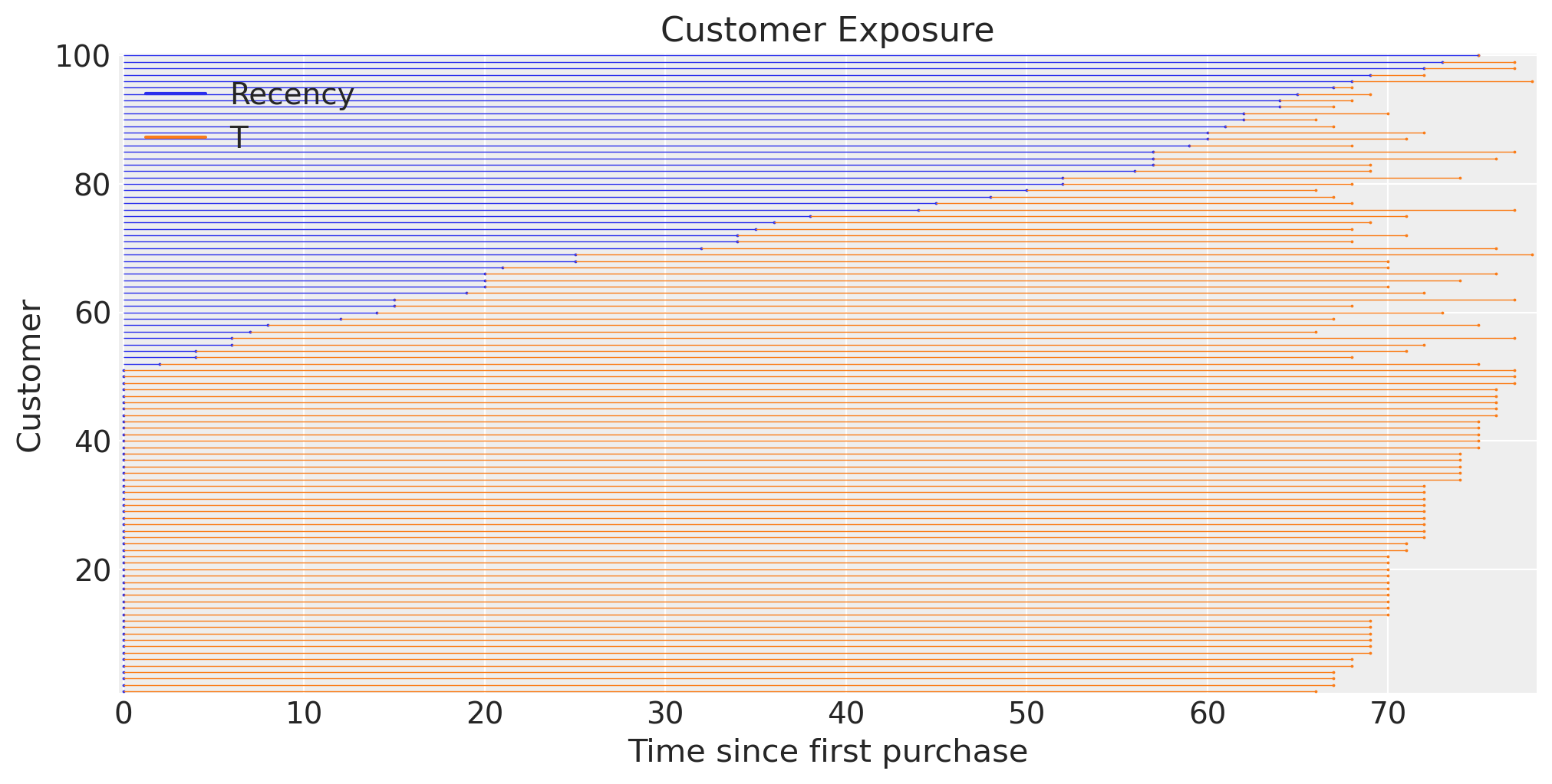 To visualize data in RFM format, we can plot the recency and T of the customers with the plot_customer_exposure function. We see a large chunk (>60%) of customers haven’t made another purchase in a while.