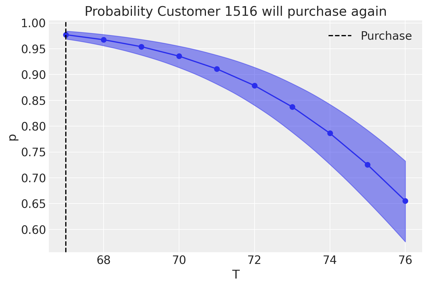 From the plot above, say that customer 1516 makes a purchase at week 73.5, just over 6 weeks after they have made their last recorded purchase. We can see that the probability of the customer returning quickly goes back up!
