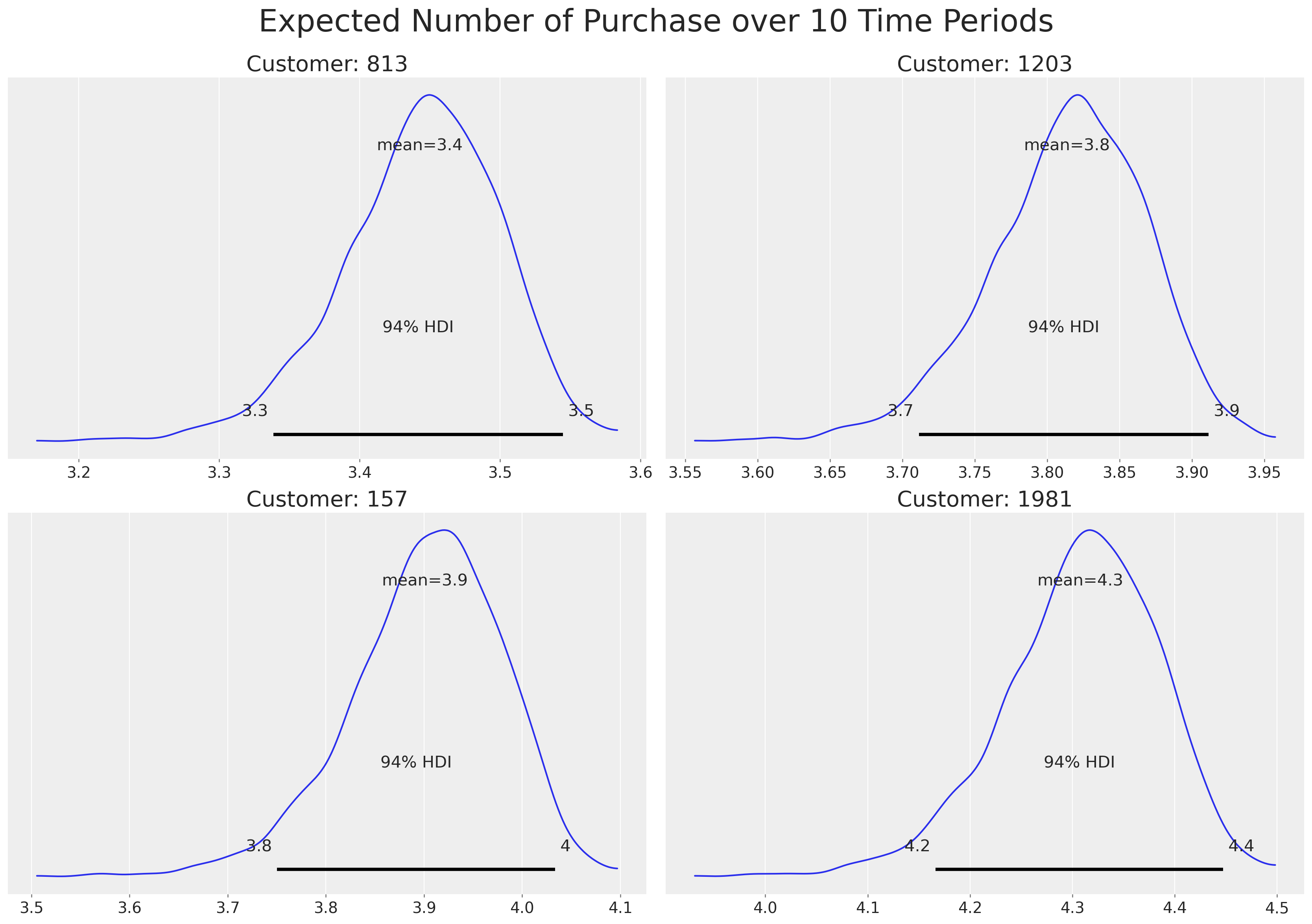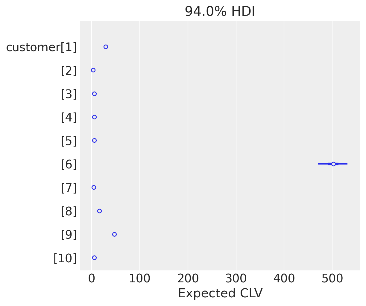 clv_estimate.isel(customer_id=range(10)), combined=True, labeller=labeller