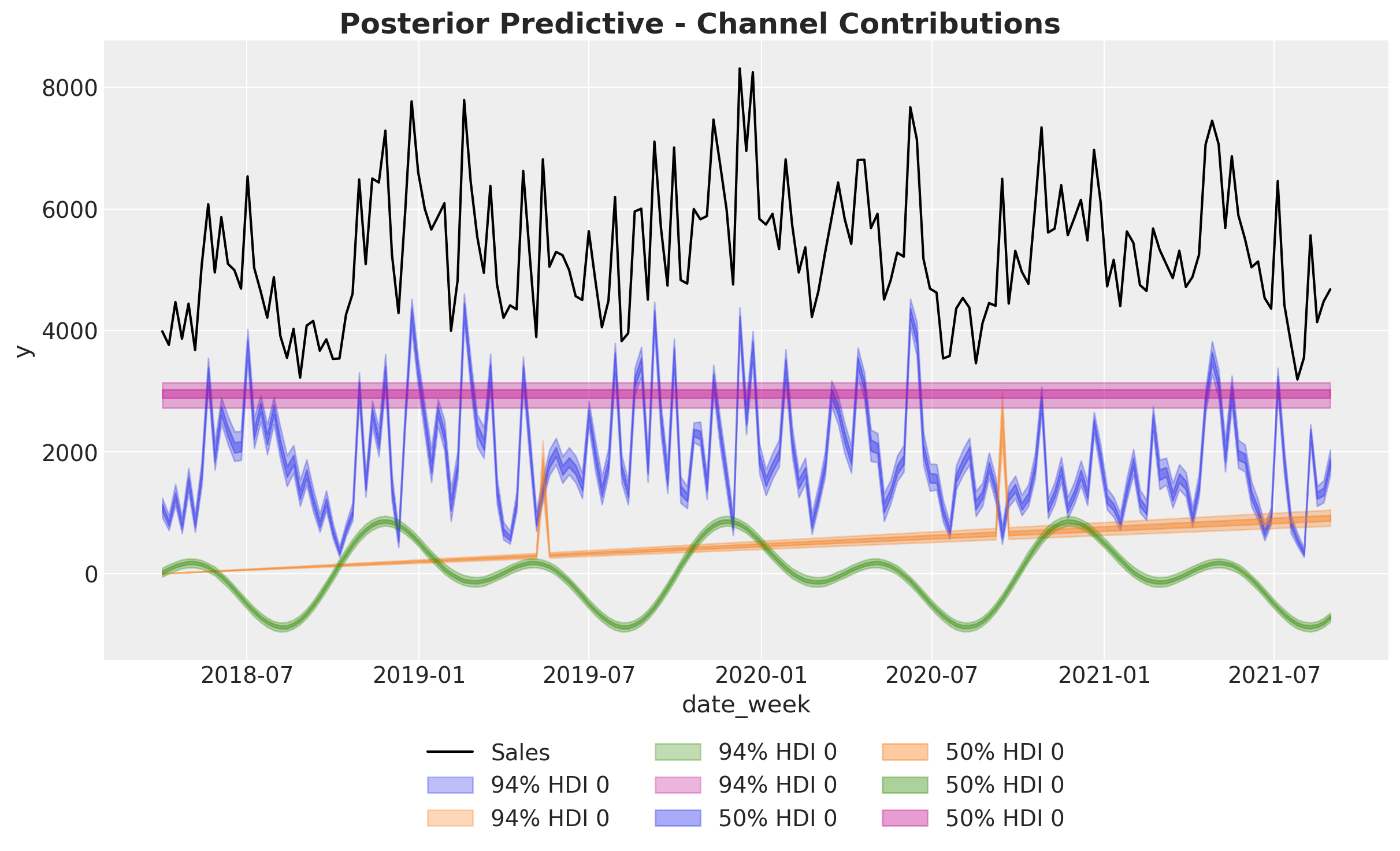 Let’s see how we can fit a basic MMM model to understand these effects and measure channel contributions.