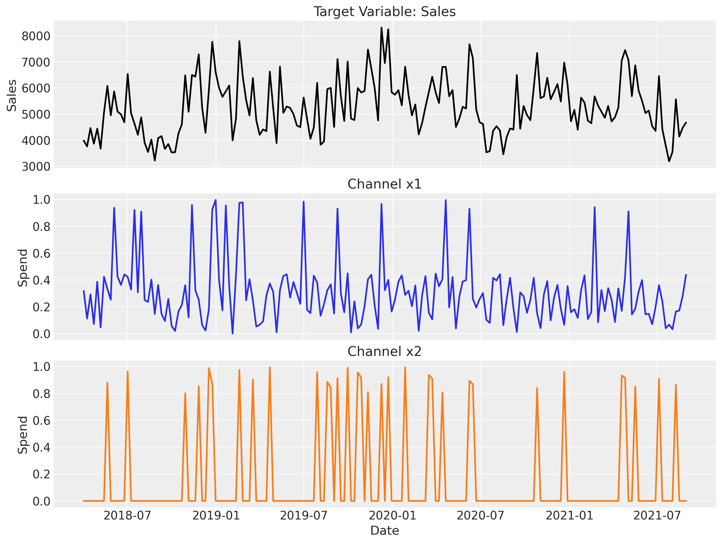 • If you want to see a complete end-to-end analysis, see MMM End-to-End Case Study. Here we take a “real” world dataset and go through the entire process of model specification, fitting, optimization and scenario planning.