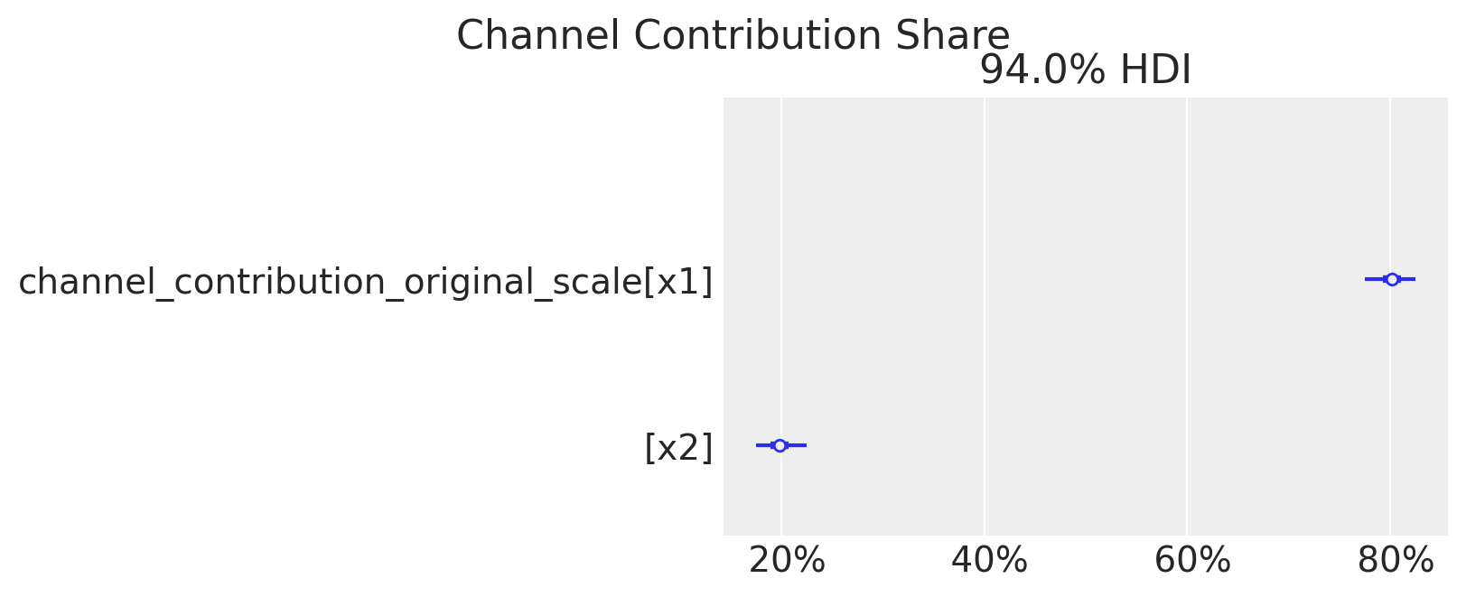 fig = mmm.plot.channel_contribution_share_hdi(figsize=(8, 3));