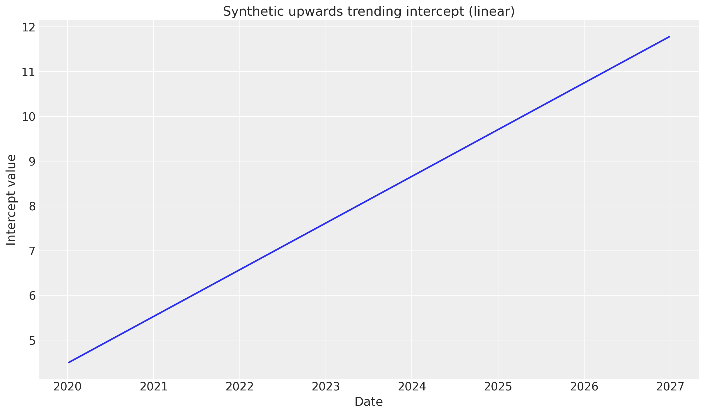2. Upward trending sales: The intercept is a linearly increasing function, mimicking overall sales growth not explained by marketing or controls. Again, you would normally use a linear increasing control variable for this, but let’s see what happens when we use a time-varying parameter.