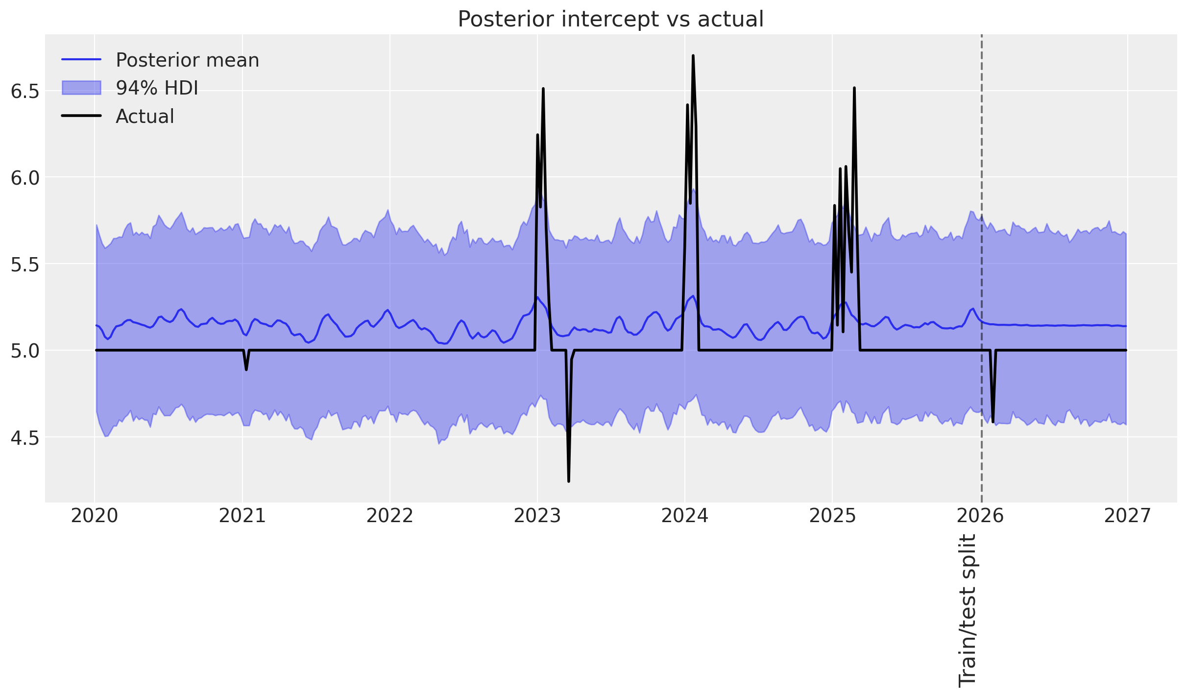 Judging from the posterior predictive distribution of the time-varying intercept, there is a problem with the model.