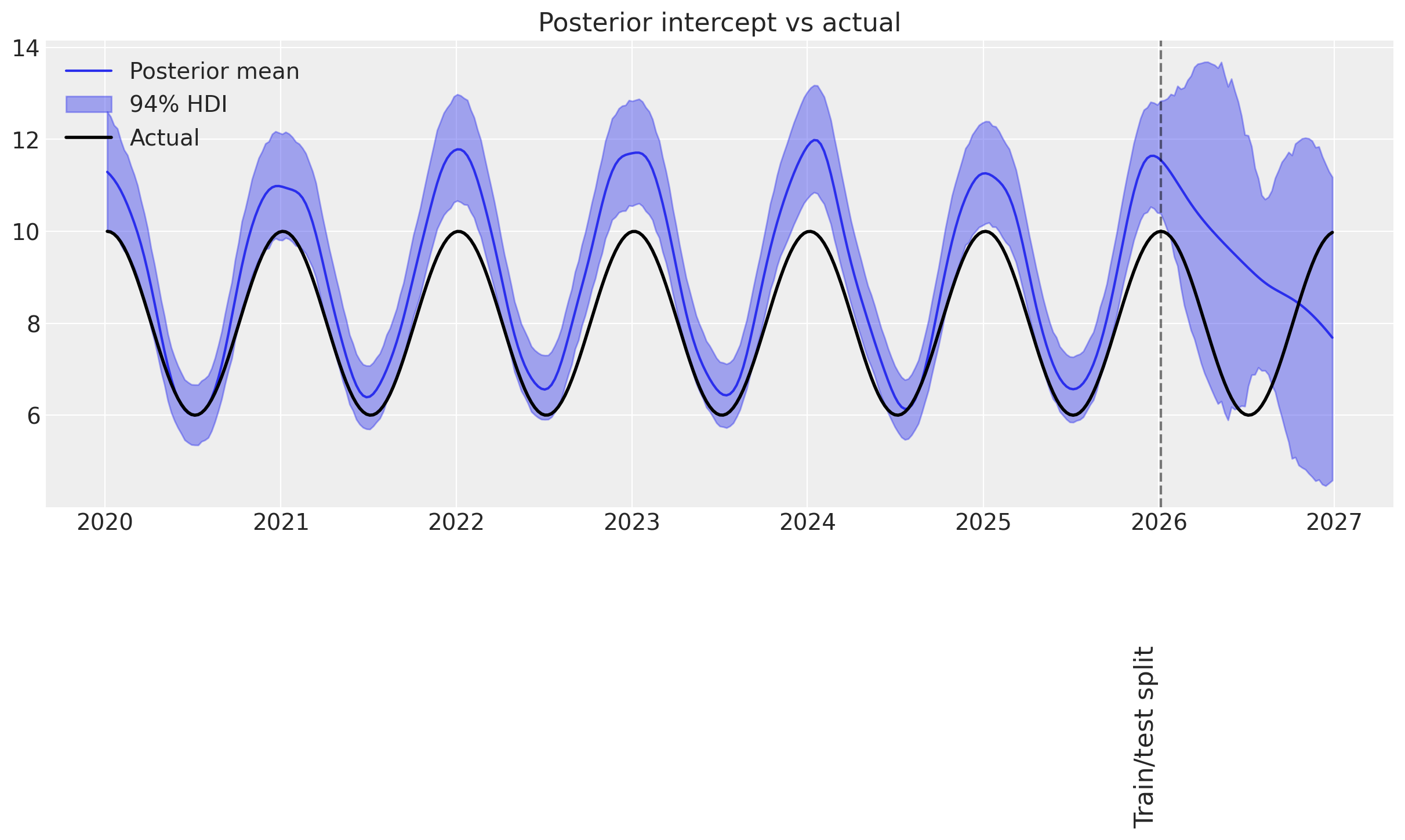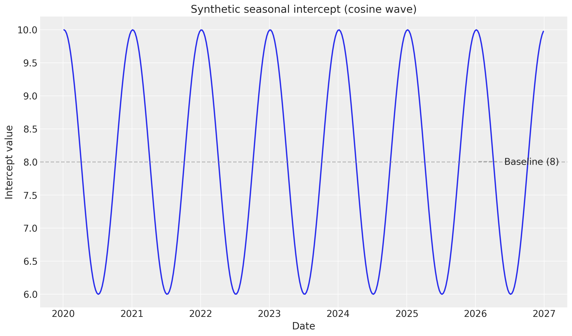 1. Yearly seasonality: The intercept is a cosine function with a period of one year. Normally, one would use a Fourier basis to model seasonality, but let’s see what happens when we use a time-varying intercept 🤷‍♂️.